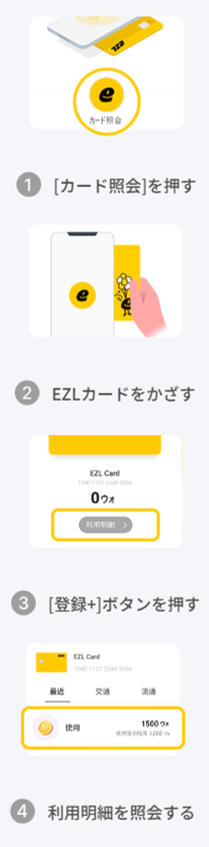 「ezl TOP-UP」アプリのダウンロードが完了したら、お持ちのカードを登録して利用明細をご確認ください。